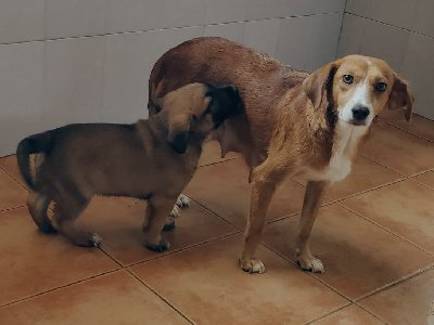 Ze is een zoveelste moedertje dat ergens een nestje kreeg in the middle of nowhere. Dit keer in de achterbuurten van Algeciras waar geen mens weet heeft van wat ook. Ze had zichzelf in een ton verscholen om haar pupjes te beschermen. Mama is eerder een klein-medium hondje van ongeveer 12 kg, en heeft nog niet veel geluk ervaren als je ziet hoe bang ze is.