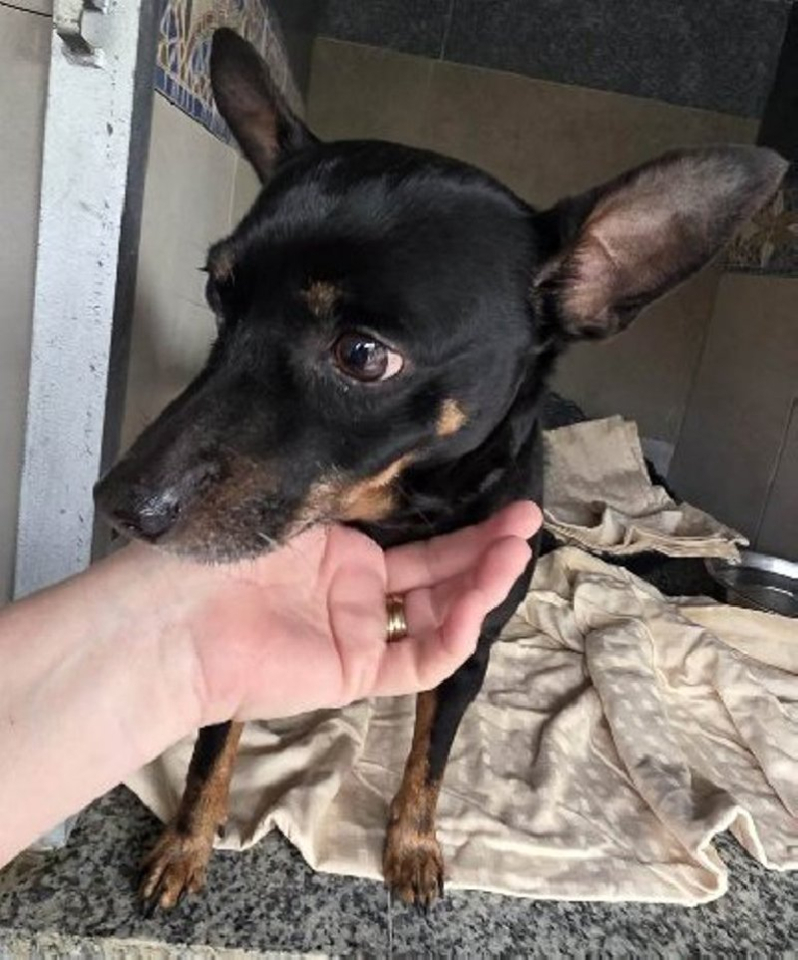 Tijdens ons bezoek aan onze collega's in Algeciras stond er een echtpaar aan de deur met een hondje. Een klein "mislukt" Pincherke dat al 3 maanden aan een keukentafel gebonden zat, want ze wisten niet hoe ze met hem moesten om gaan. Als hij blafte kreeg hij klappen, zo eenvoudig was het, en nu hadden ze gehoord dat wij hem misschien wel wilden redden.