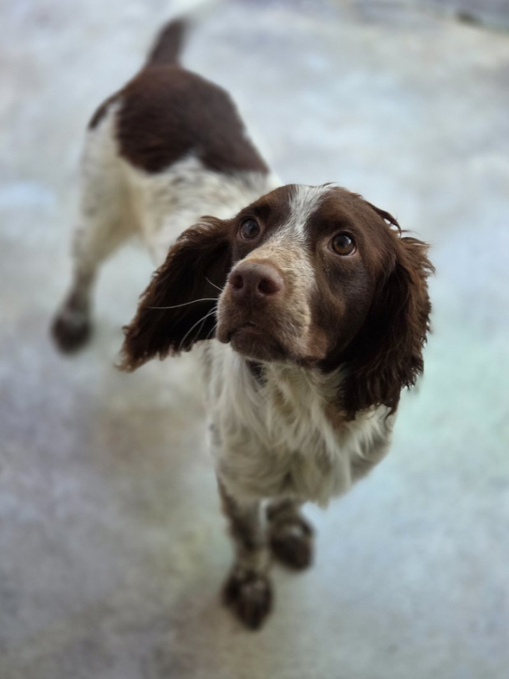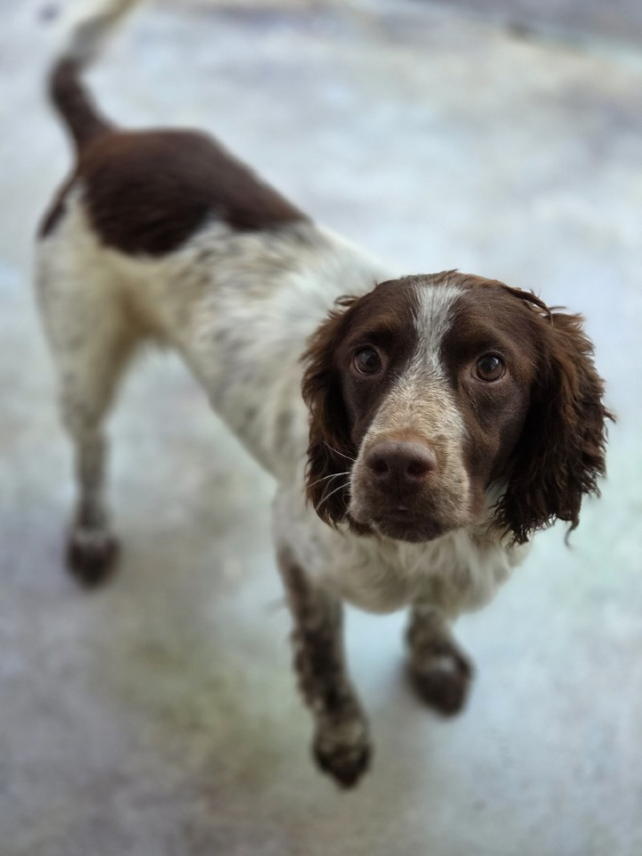 Leon is een middelgrote hond (Epagneul Breton x Springer Spaniel): hij is ca. 42 cm hoog en weegt ca. 11 kg.
