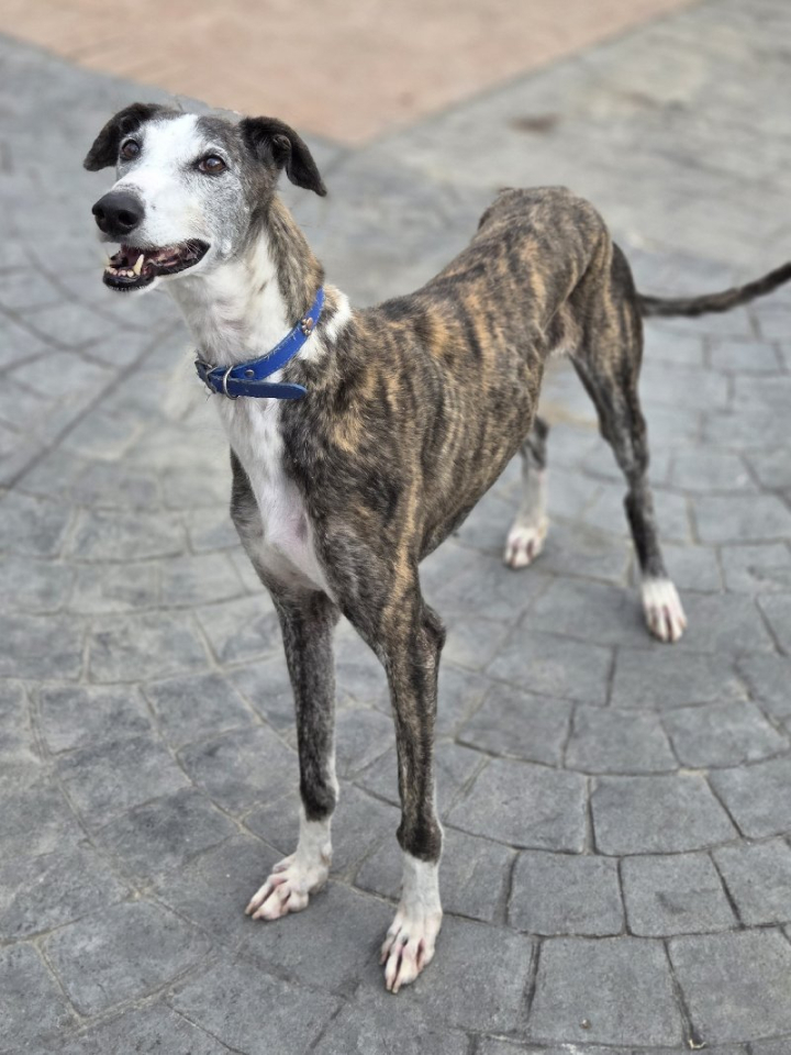 Montesa is een grote hond (Galgo Espagnol): zij is ca. 62 cm hoog en weegt ca. 23 kg.