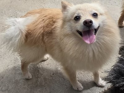 Pommelie is een kleine hond (Pomeranian): zij is ca. 30 cm hoog en weegt ca. 4 kg.