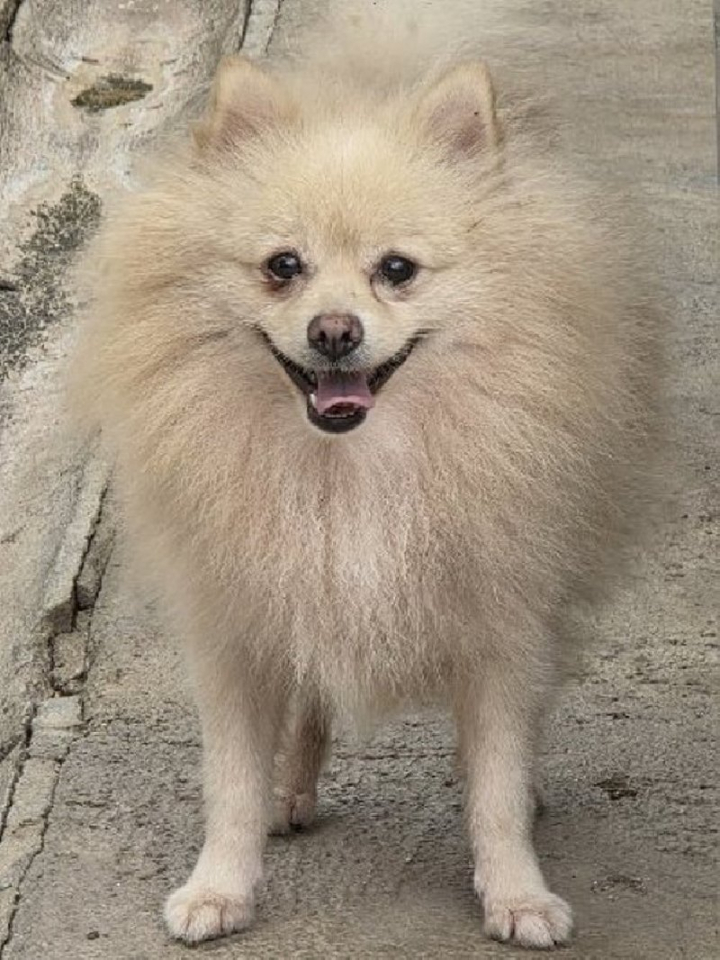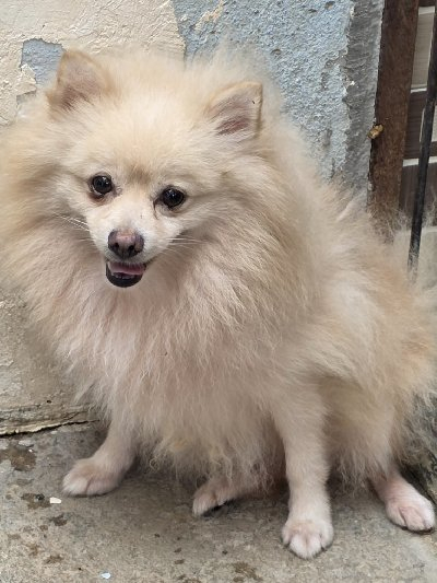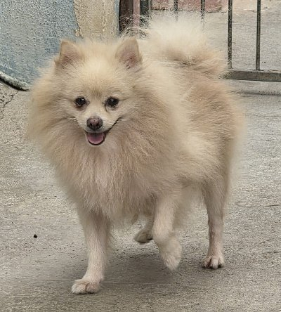 Poupoef is een kleine hond (Pomeranian): hij is ca. 30 cm hoog en weegt ca. 4 kg.