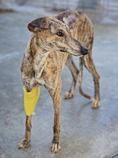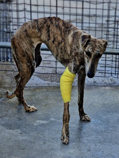 Na elk transport gaat het weer los. Ook al is de camion nog maar net vertrokken, mensen staan gewoon aan de deur aan te schuiven om hun hond of kat te kunnen afgeven nu er weer enkele plaatsen vrij kwamen, het is werkelijk onvoorstelbaar. Zo kwam ook deze Galgo binnen, mager, verwaarloosd, en duidelijk mishandeld. Het zoveelste slachtoffer van een jager.