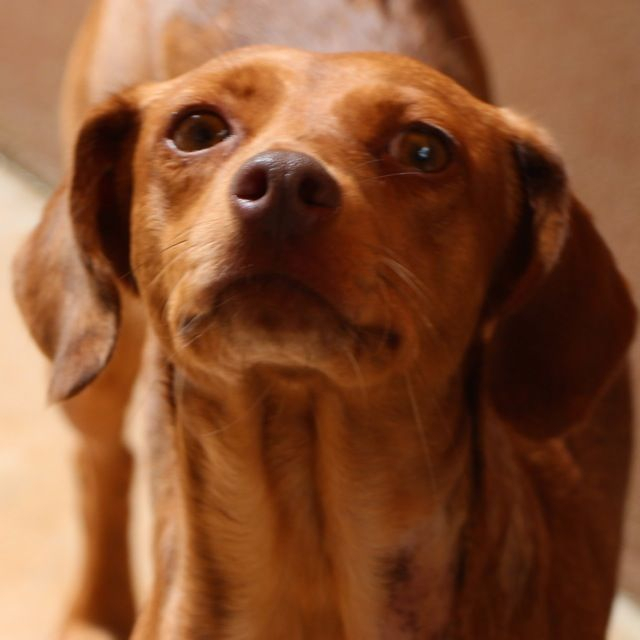 Dominique is een mooi hondje dat op straat gevonden werd en naar Amalia, een Spaanse opvangmama, gebracht. Andere honden zijn geen probleem voor dit bruintje, maar mensen moeten met haar wat geduld hebben.
