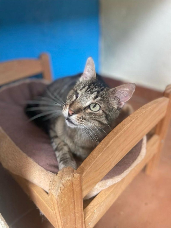 Amedia is een wilde kat die bij ons mag blijven leven op de poezenberg, hij is gered geweest uit een kolonie nadat er werd vast gesteld dat hij een zeer zwaar gekwetst oog had. Hij moest onmiddellijk worden geopereerd, en leeft sinds met 1 oogje, echter hij blijft wild en wil zijn vrijheid en zelfstandigheid terug. Hij laat zich niet aanraken, daarom wordt hij een bewoner bij voor ons, weert een zorg meer. maar met liefde voor deze sukkelaar.