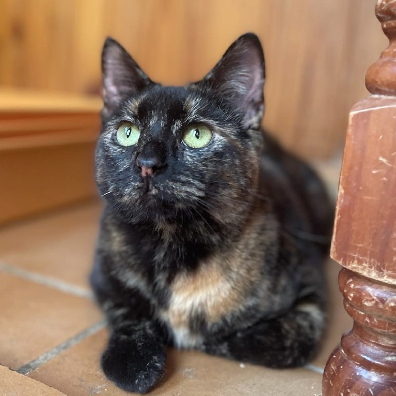 Rajah is een kleine cat (European Shorthair): zij is ca. 25 cm hoog en weegt ca. 3 kg.