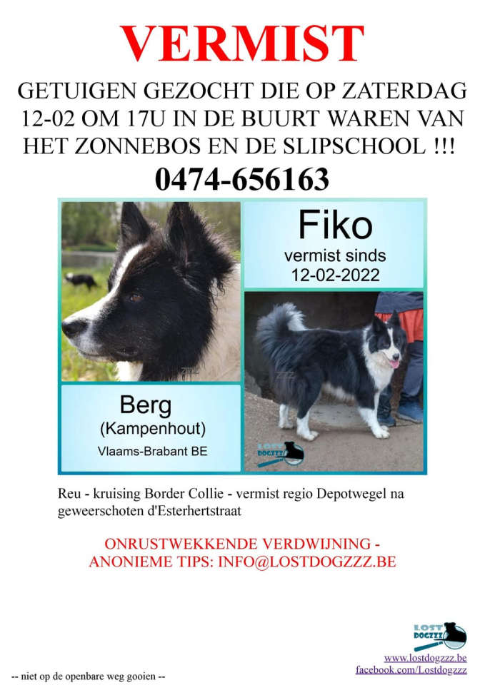 Aub help de baasjes en Fiko. Kan iedereen die daar zaterdag in de buurt was en iets verdacht gehoord of gezien heeft (jagers die op dat ogenblik niet mochten jagen, geweerschoten....of iets anders) aub iets laten weten? (op de contactgegevens op de flyer of pb). Ik kan U ook de flyer bezorgen die verder kan gedeeld worden.