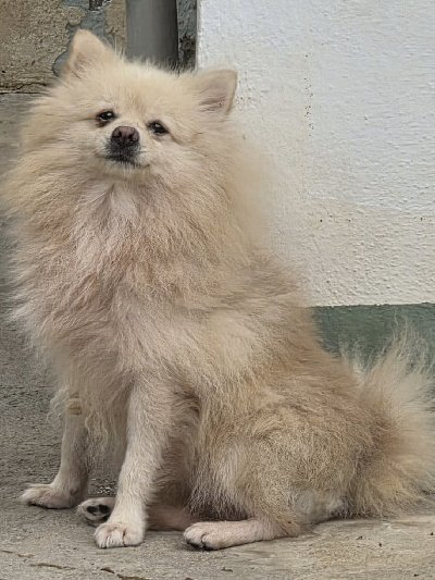 Poupoef is een kleine hond (Pomeranian): hij is ca. 30 cm hoog en weegt ca. 4 kg.