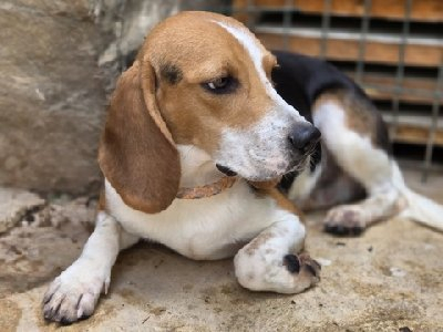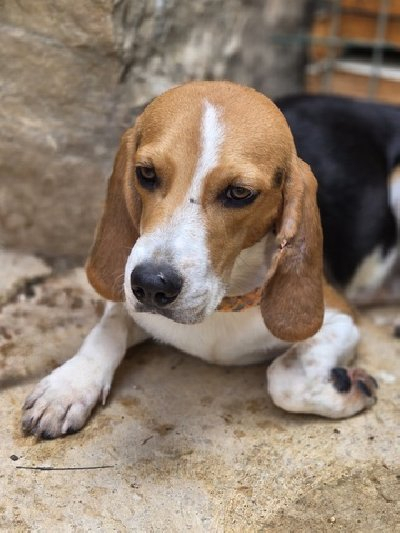 Kostas is een middelgrote hond (Beagle): hij is ca. 42 cm hoog en weegt ca. 14 kg.