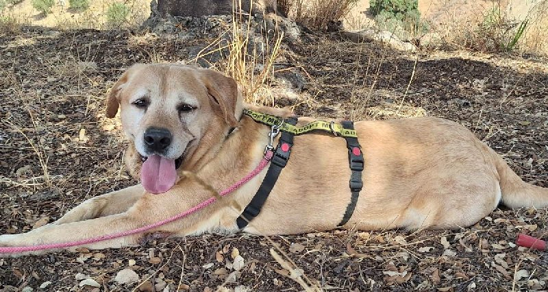 Hij is een brave ziel, een echte Labrador, heel lief voor mensen, maar hij heeft nooit samengeleefd met andere honden. Daar proberen we hem nu aan te laten wennen.