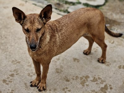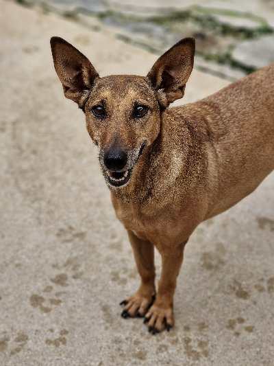 Carmen is een middelgrote hond (Podenco): zij is ca. 41 cm hoog en weegt ca. 9 kg.