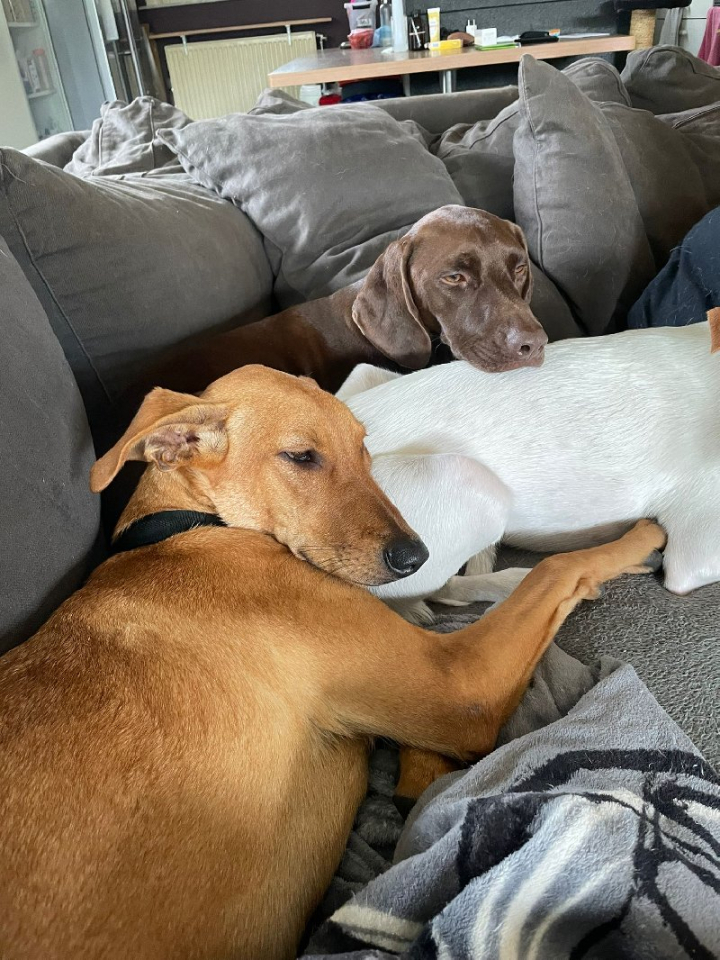 Het liefst van al ligt Paula de hele dag tegen je aan in de zetel, ze is zo aanhankelijk en verlangt echt naar aandacht en liefde! Maar naast menselijk contact hebben we ook gemerkt dat ze echt een hondenvriendje nodig heeft. Niet enkel als speelmaatje, maar vooral om het gedrag te kopieren. Paula heeft dus nood aan baasjes met veel tijd, liefde en kennis, een grote tuin en een andere hond. Wie kan haar een nieuwe thuis geven?