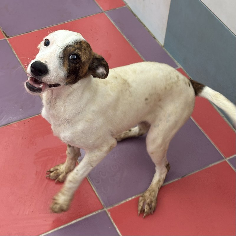 Vilainy is een middelgrote hond (Cross Podenco): zij is ca. 20 cm hoog en weegt ca. 5 kg.