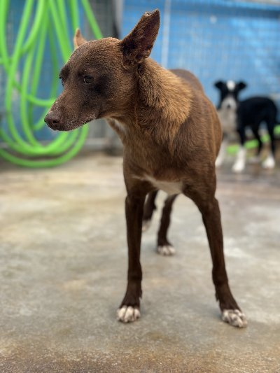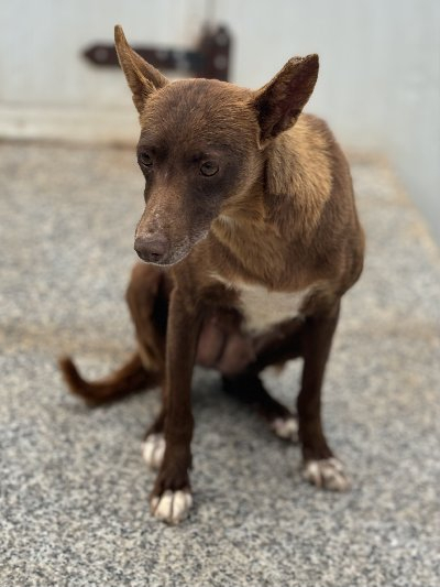 Na de hevige regenval werd een Podencootje opgemerkt dat langs de rivier liep, vergezeld door 1 pupje. Mama was erg mager, ondervoed, en liep bovendien met een zwaargehavend pootje rond. Ze was erg angstig en durfde niet naar mensen komen. Wie weet door welke hel ze heen moest!? Met heel veel geduld en na verschillende pogingen kon ze uiteindelijk gevangen worden in een vangkooi.