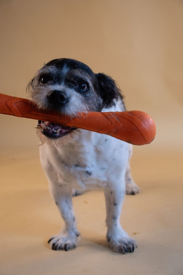 Hij vindt wandelen fantastisch, is nog lekker speels en weet met zijn guitige blik iedereen rond zijn poot te winden.