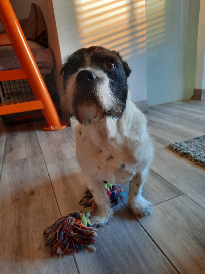 Ozzie , een mix Franse buldog werd 10 jaar geleden op 1-jarige leeftijd geadopteerd.